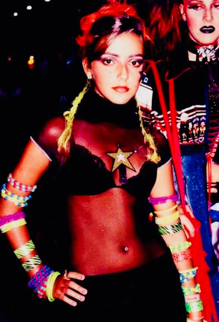 | minha irmã, Raíssa que se voluntariou para ser modelo de um dos desfiles da marca no Mercado Mundo Mix (detalhe para camiseta eletrônica, pulseiras de stick e belly piercing fake de luz colorida. |